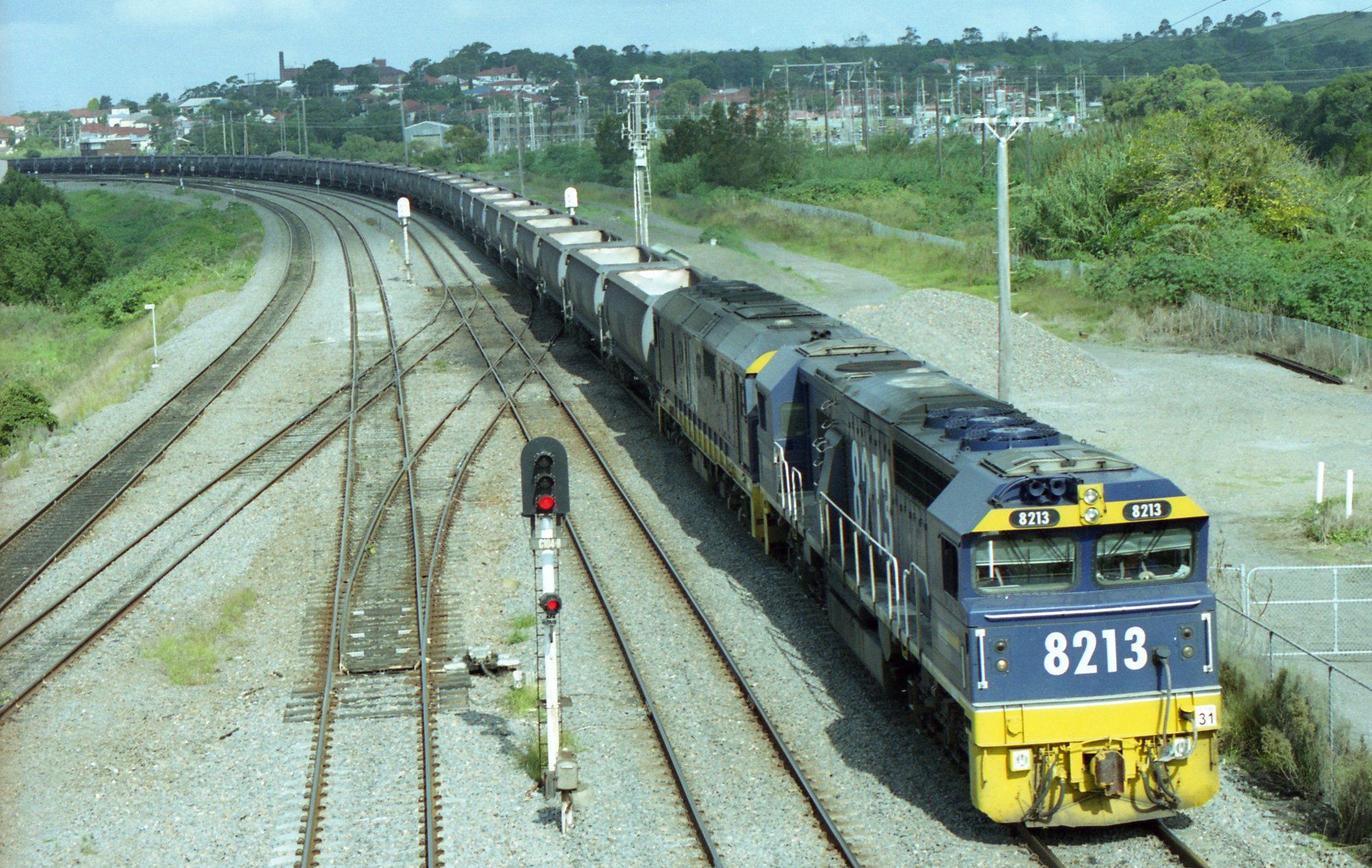 8213 and an 81 class lead unit 31 over the crossovers on the down coal road at Hanbury Junction, NSW, April 2004