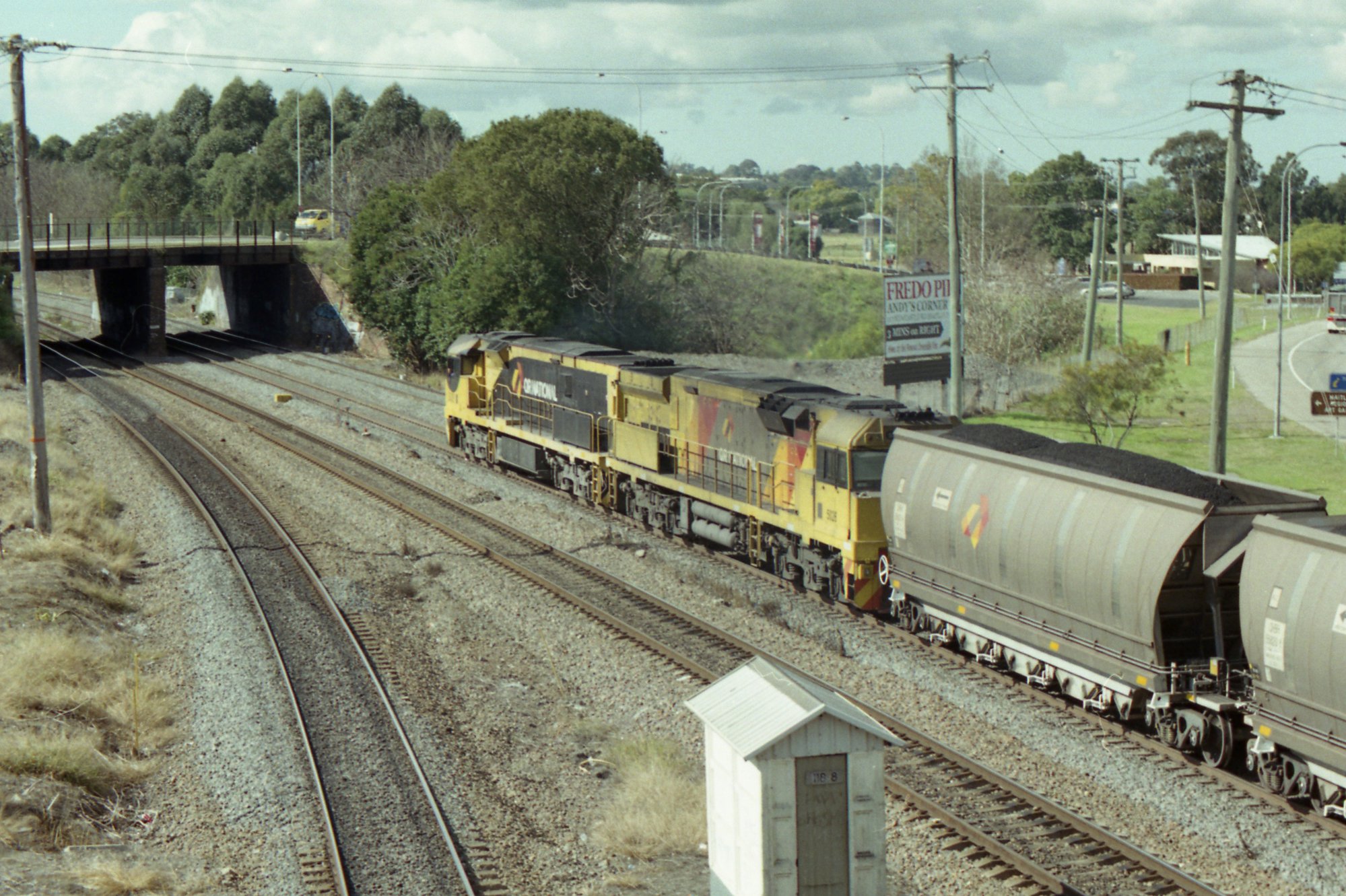 TW, O Aurizon 5000 class locomotives at the head of a coal train are seen about to pass under the High Street