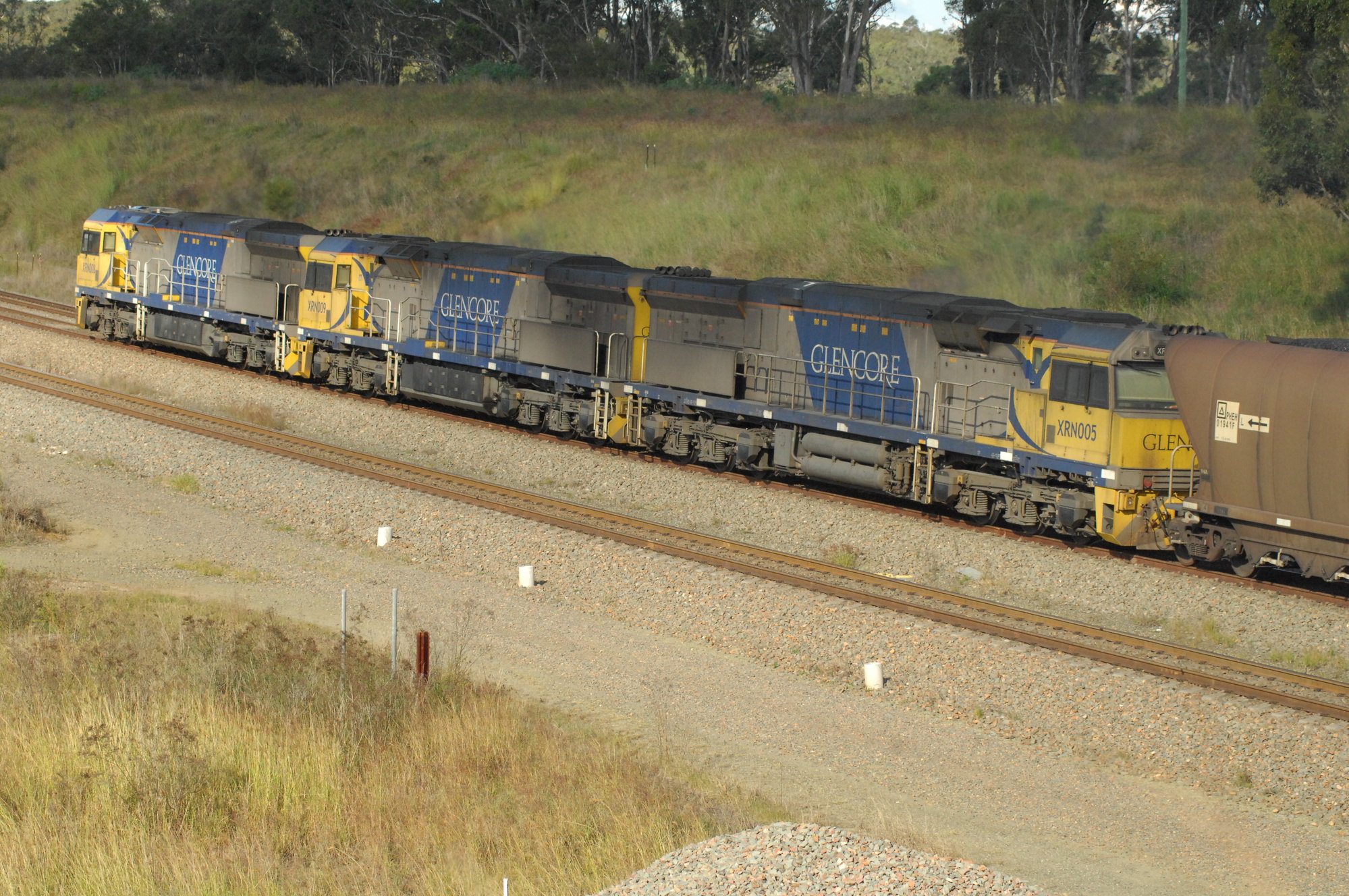 XRN001, XRN009 and XRN005 powering through Belford with a loaded coal train on the up main at Belford, NSW, 15 May 2017