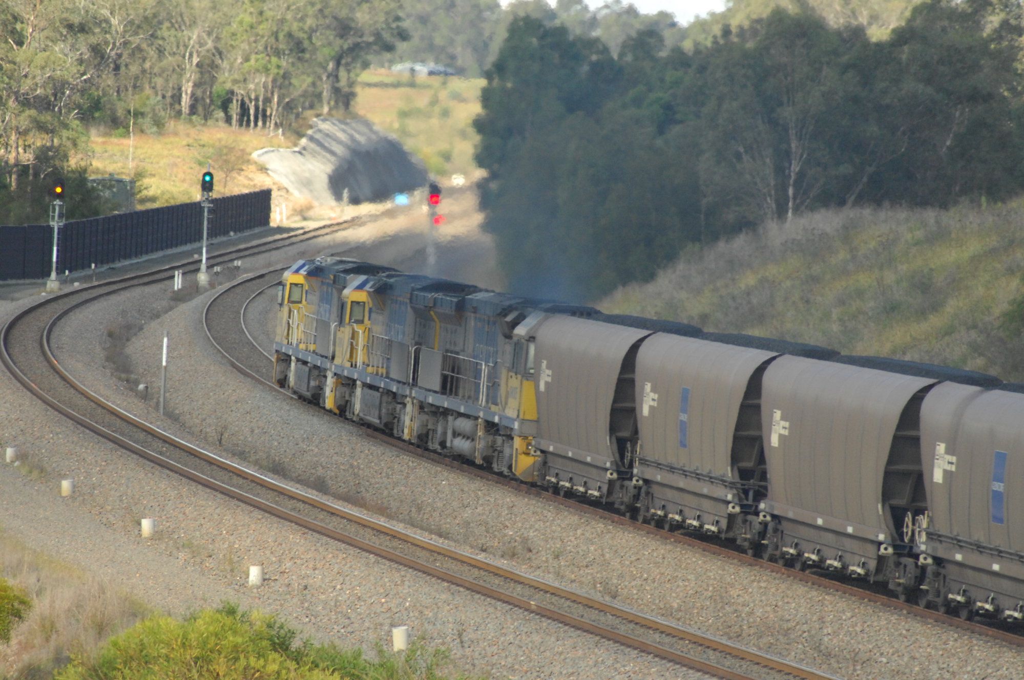 Three Xtrata locomotives on a loaded coal train on the up main at Belford, NSW, 15 February 2017