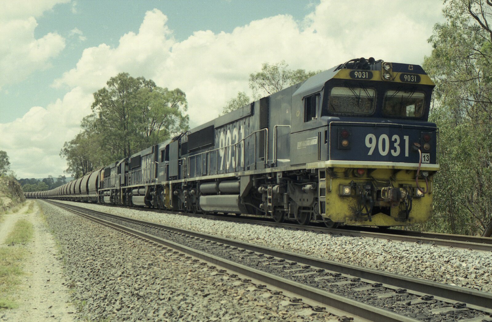 9031 and two classmates on unit 13 stand on the grade on the up main between Grasstree and Antiene, NSW, November 2012