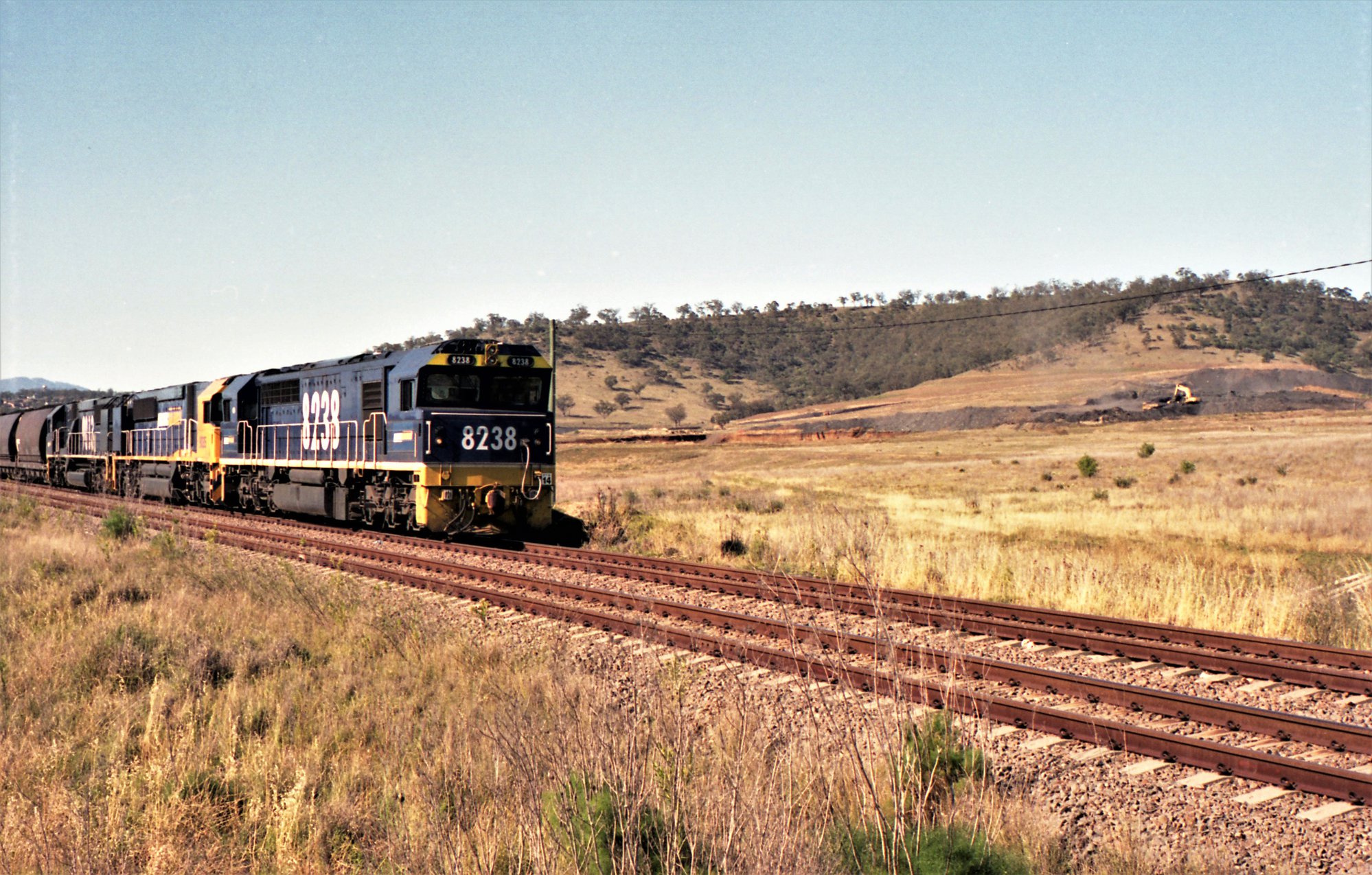 Sansom, Peter, 8238 and two 90 class locomotives on unit 14 at Dartbrook near Aberdeen, NSW, December 2006 (Between 1st December 2006 and 31st December 2006), [OL_Sansom_2019_HCT_0734]. Living Histories, accessed 20/03/2026, https://livinghistories.newcastle.edu.au/nodes/view/97883