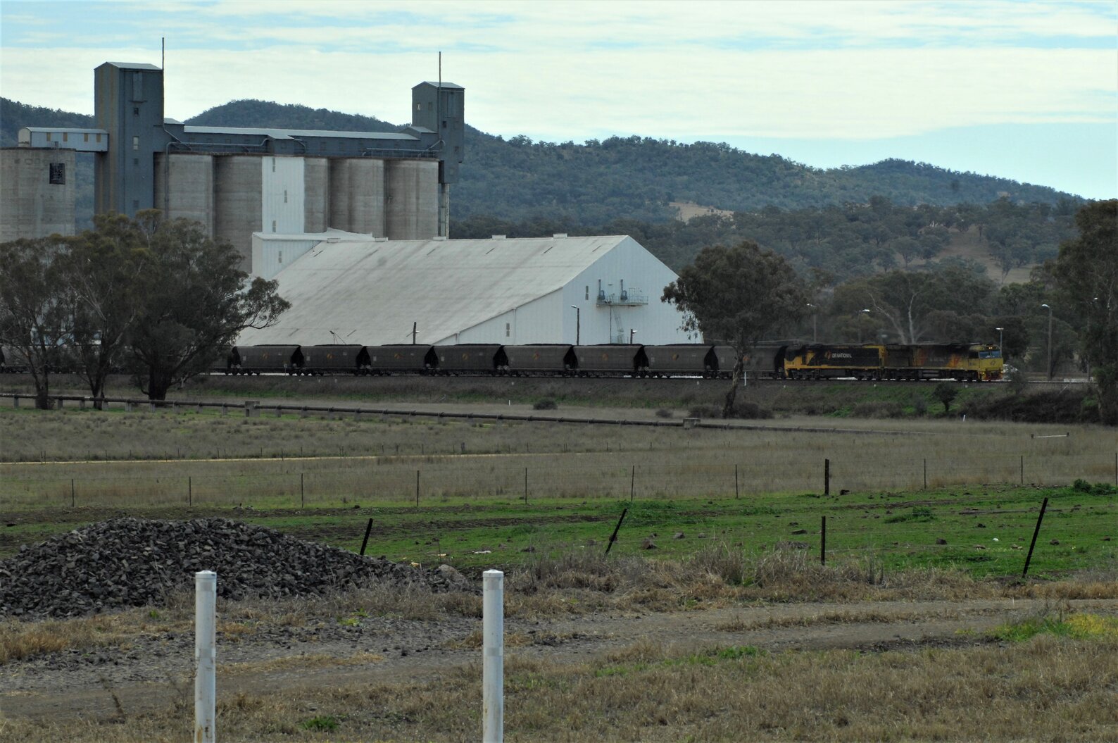 An Aurizon loaded coal train passing the silos as it approaches Werris Creek, NSW, 1 August 2015