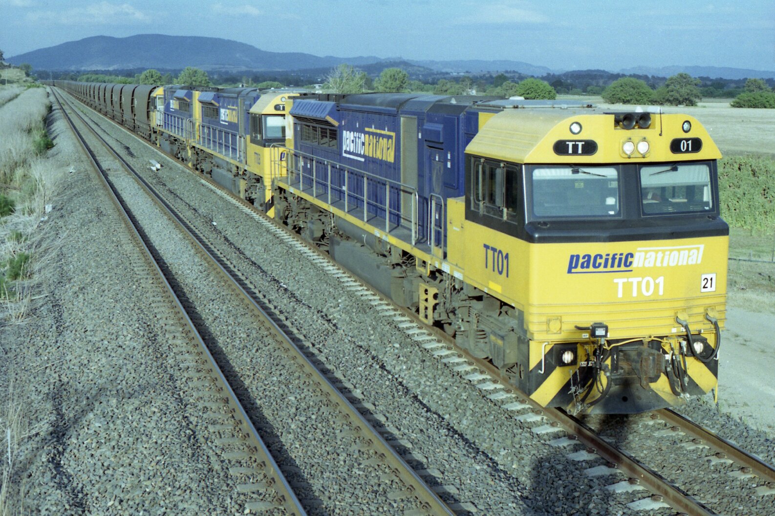 TT01 and two classmates on unit 21 wait in the loop at Bengalla to cross another train, October 2012