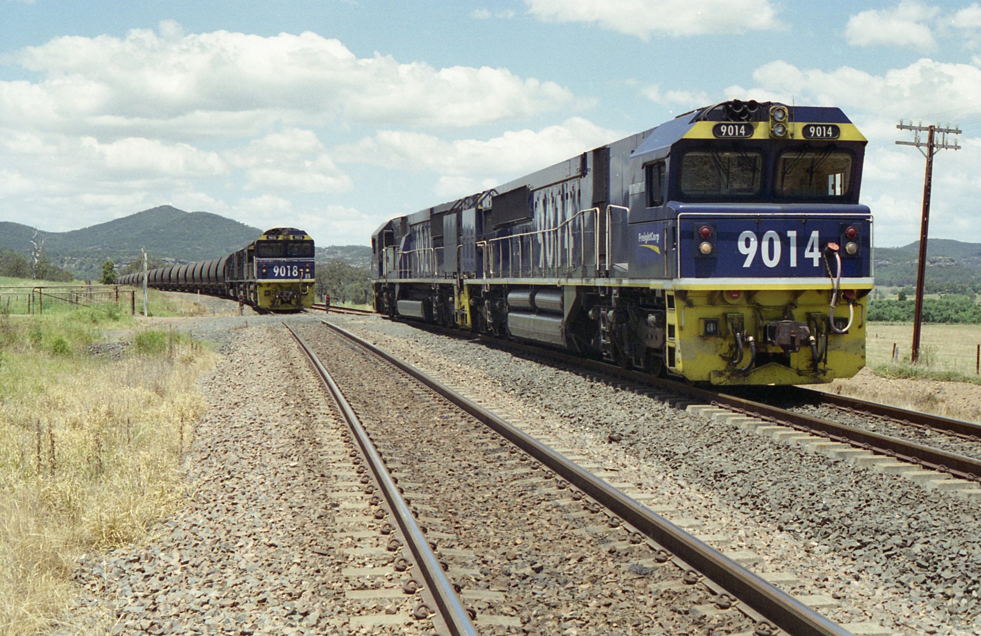 Light engines 9014 and 9021 cross 9018 and two classmates on unit 2 at Sandy Hollow, NSW