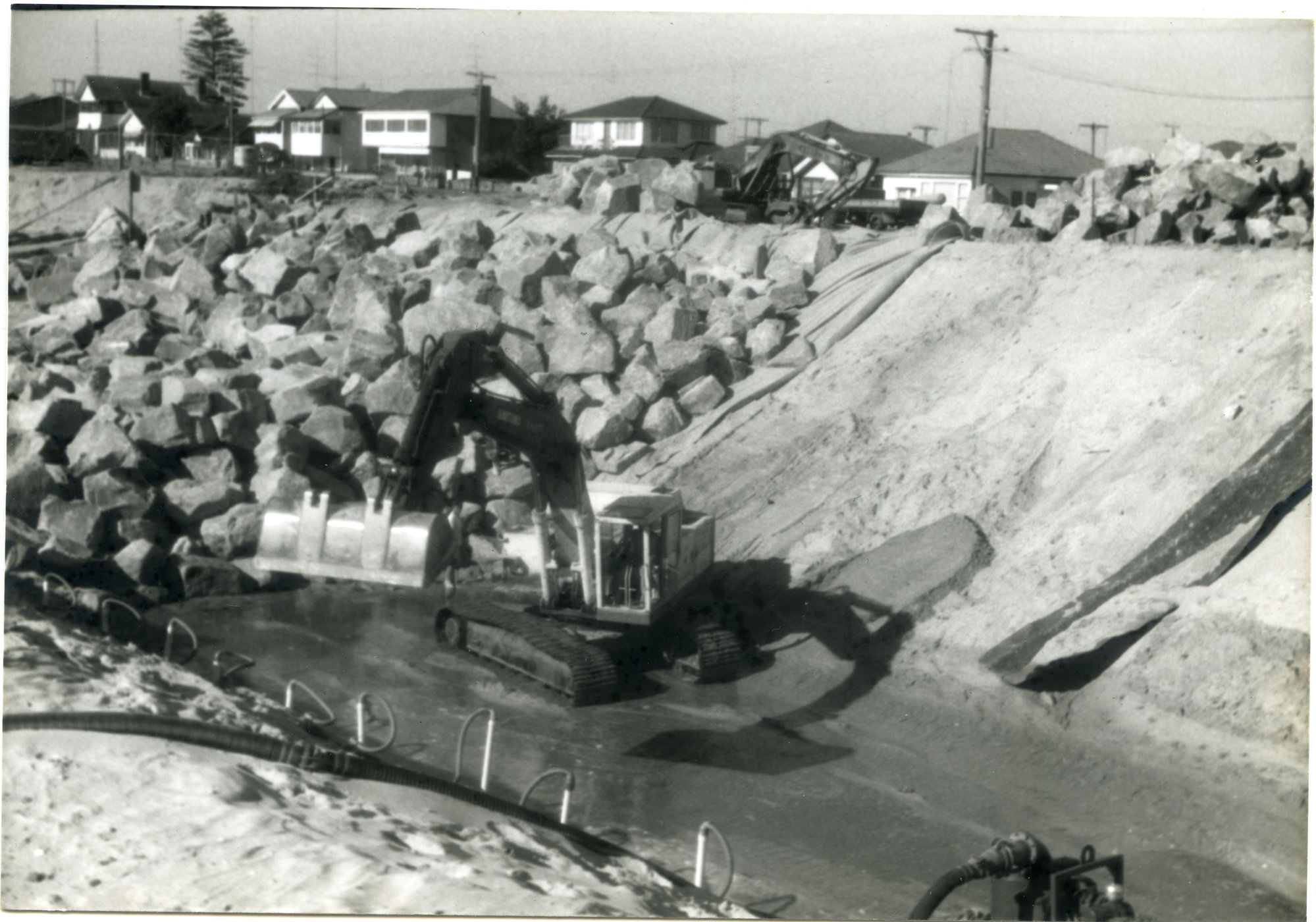 Bulldozer working on retainer levy bank, Stockton, NSW, November 1989 (November 1989), [C2773(i)010]. Living Histories, accessed 17/04/2026, https://livinghistories.newcastle.edu.au/nodes/view/98261