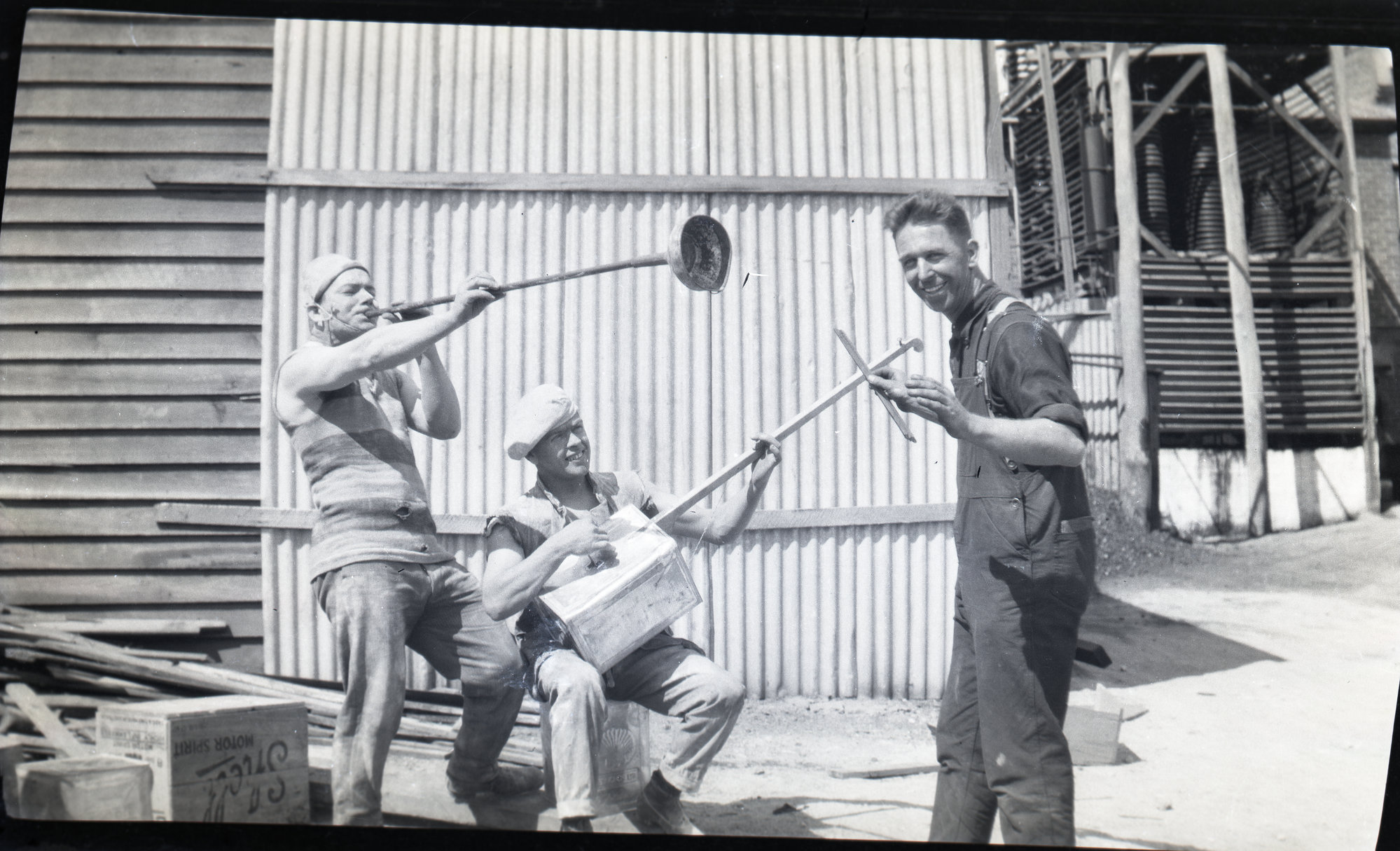 Three men clowning around with makeshift musical instruments, [n.d.] ([n.d.]), [ACC139]. Living Histories, accessed 18/03/2026, https://livinghistories.newcastle.edu.au/nodes/view/99509